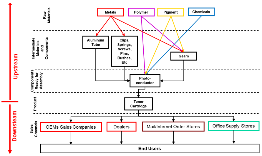 As can be seen from the diagram, the upstream portion of the chain from the product is “product-centric” and the downstream portion is marketing-centric. The upstream portion of the supply chain from the toner cartridge product perspective, comprises multiple vertical markets.