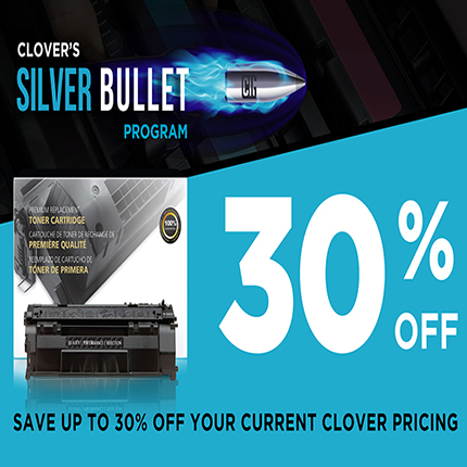 Clover Imaging Group rolls out a new partner program designed to help office technology dealers gain market share and close more business. With Clover’s Silver Bullet program, dealers will receive up to 30% off their current pricing when they convert accounts that purchase HP imaging supplies to Clover’s premium quality remanufactured printer cartridges.